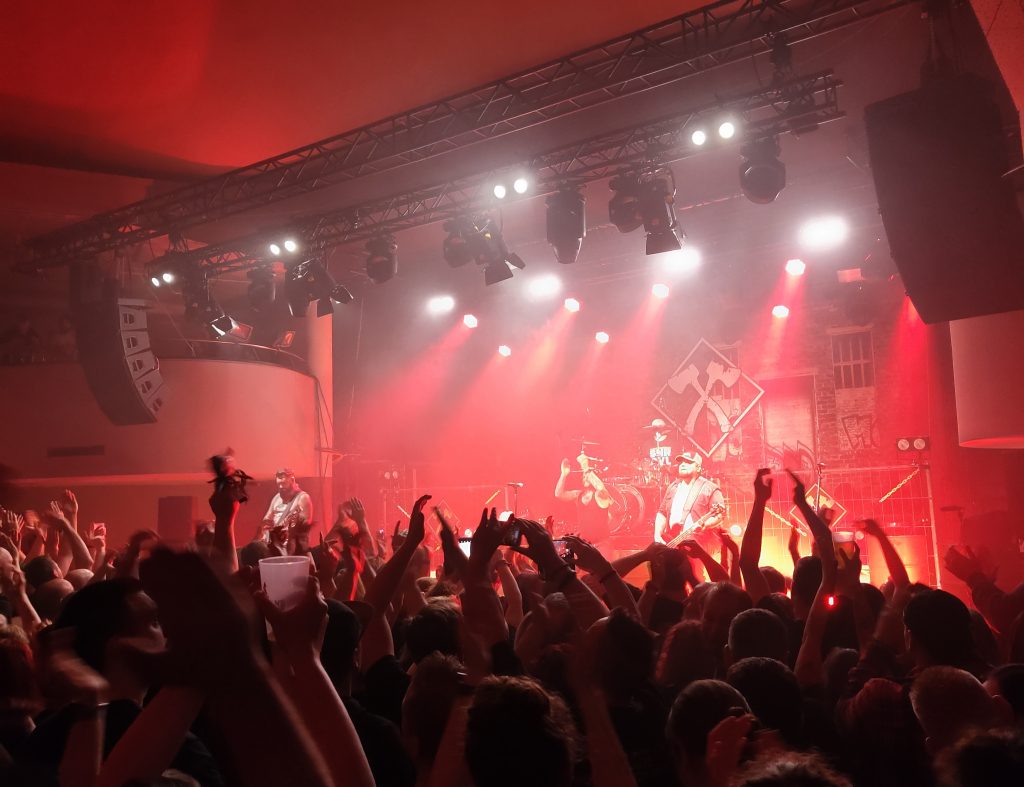 Nach kurzer Umbaupause ging es dann endlich los. Nicht nur als stärkster Song des neuen Albums, sondern auch als Opener schallte „Unter ferner Liefen“ durch die Lautsprecher. Geil! Die Menge ab Sekunde 1 voll mit dabei. Das Bühnenbild bestand aus Bauzäunen, „brennenden“ Tonnen und Absperrband, Barrikaden eben. Der Sound in der kleinen Halle war super ausgeglichen. Durch die hohe Decke und die Empore, ergab sich eine schöne Atmosphäre im runden Saal. Vor allem die harten Gitarren kamen live so gut rüber wie auf Platte. Generell dieser etwas härtere Sound von KH ist für mich ein Alleinstellungsmerkmal in der Deutschrockszene. Vollgas Rock’n’Roll eben. Bei „Mut gegen Perspektive“ den Text durch ein Megafon ins Mikro zu schreien funktioniert vielleicht auf Platte ganz ok, allerdings nicht live.. Das gibt Punktabzug 😉 Bei den ruhigeren Songs merkte man im Publikum wieder einmal das Deutschrock auch sehr für Zusammenhalt steht. Auf alte Kracher wie „Kein S.O.S.“ oder „Sag es laut“ hoffte man leider vergeblich (Fox weiß wovon ich spreche).